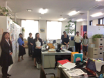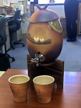 5月16日午後4時過ぎ、社内で木下社長へ誕生日プレゼントの贈呈を行いました。まずは社長の大好きな真っ赤な花束を贈呈しました。次になにやら謎めいたプレゼントが「焼酎を嗜まれる社長へ」との事で贈呈。焼酎の瓶にしても大きいし、瓶杁のそれにしても大きい箱を開けていくと、そこにはなんともおしゃれで可愛い焼酎サーバーと2組の杯が。