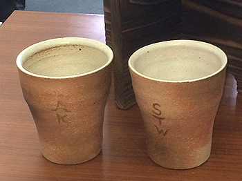 瓶には当社のロゴのようにフクロウがつがいで止まり木の上で寄り添っている感じで、杯の裏にはAK(社長)とSTW(副社長)のイニシャルが印字されています。
